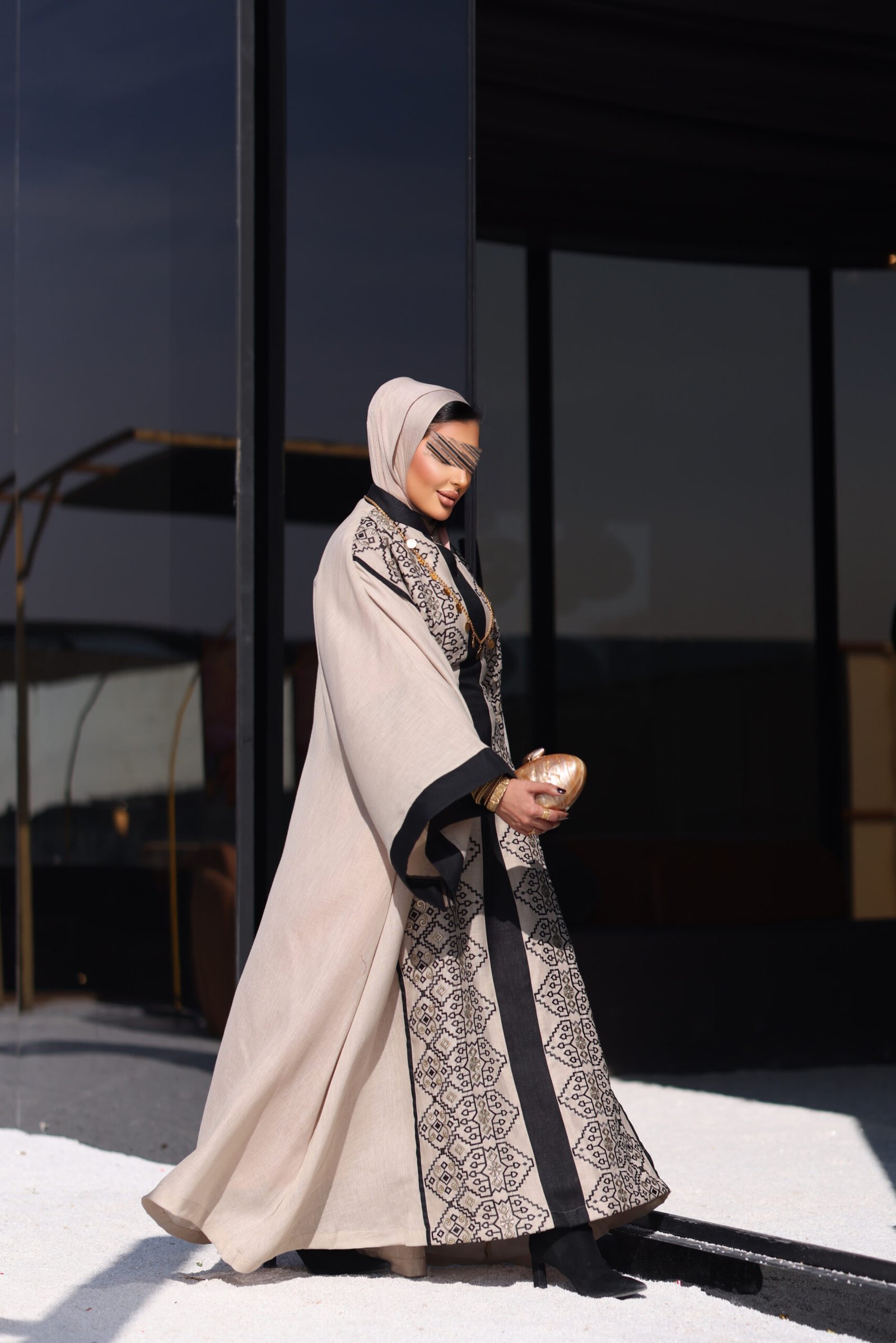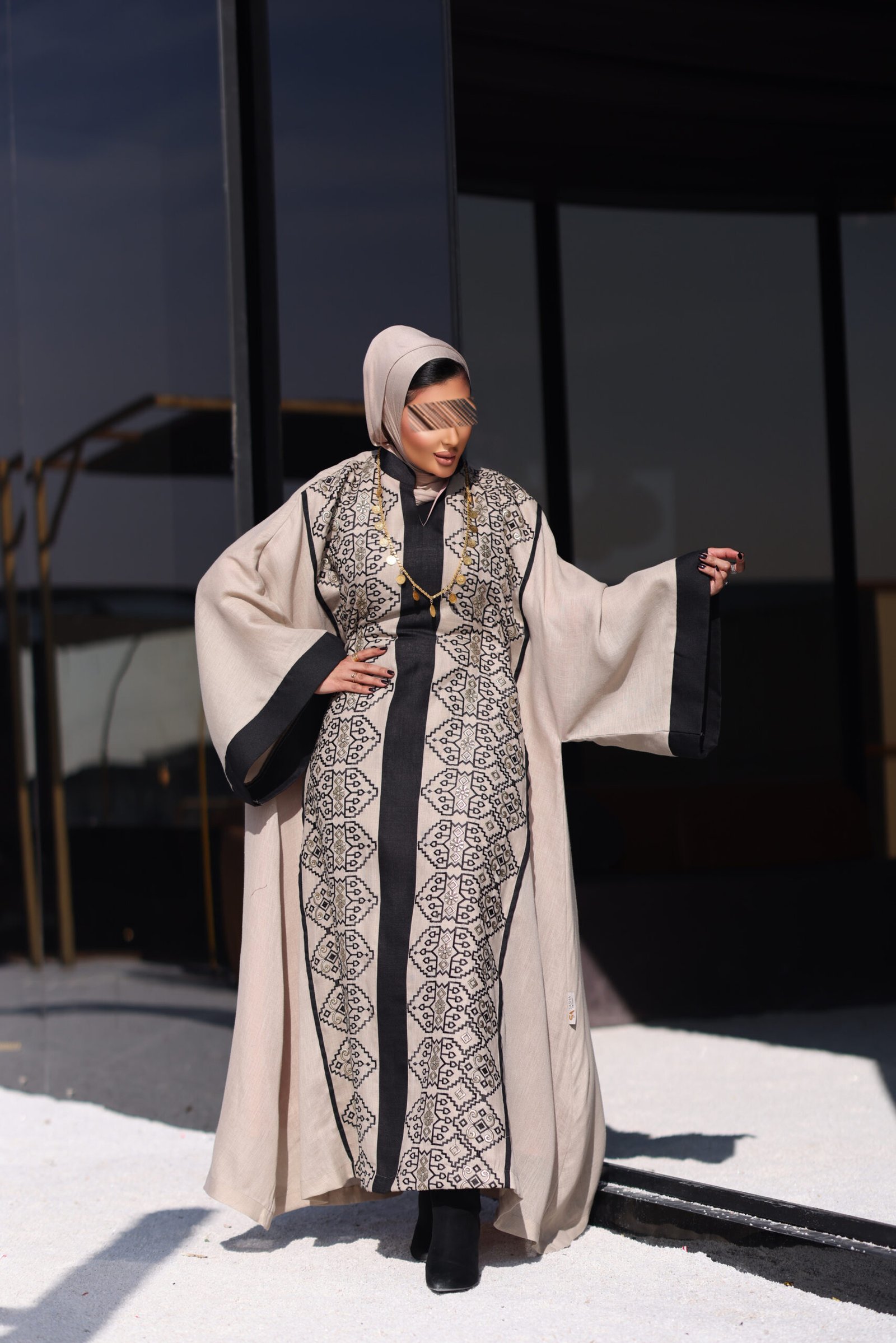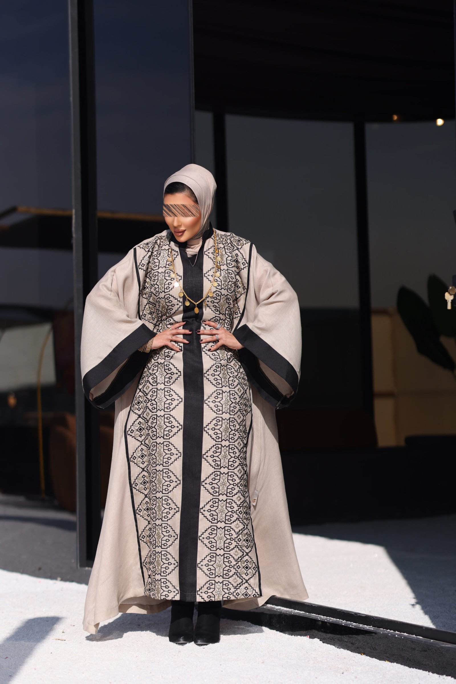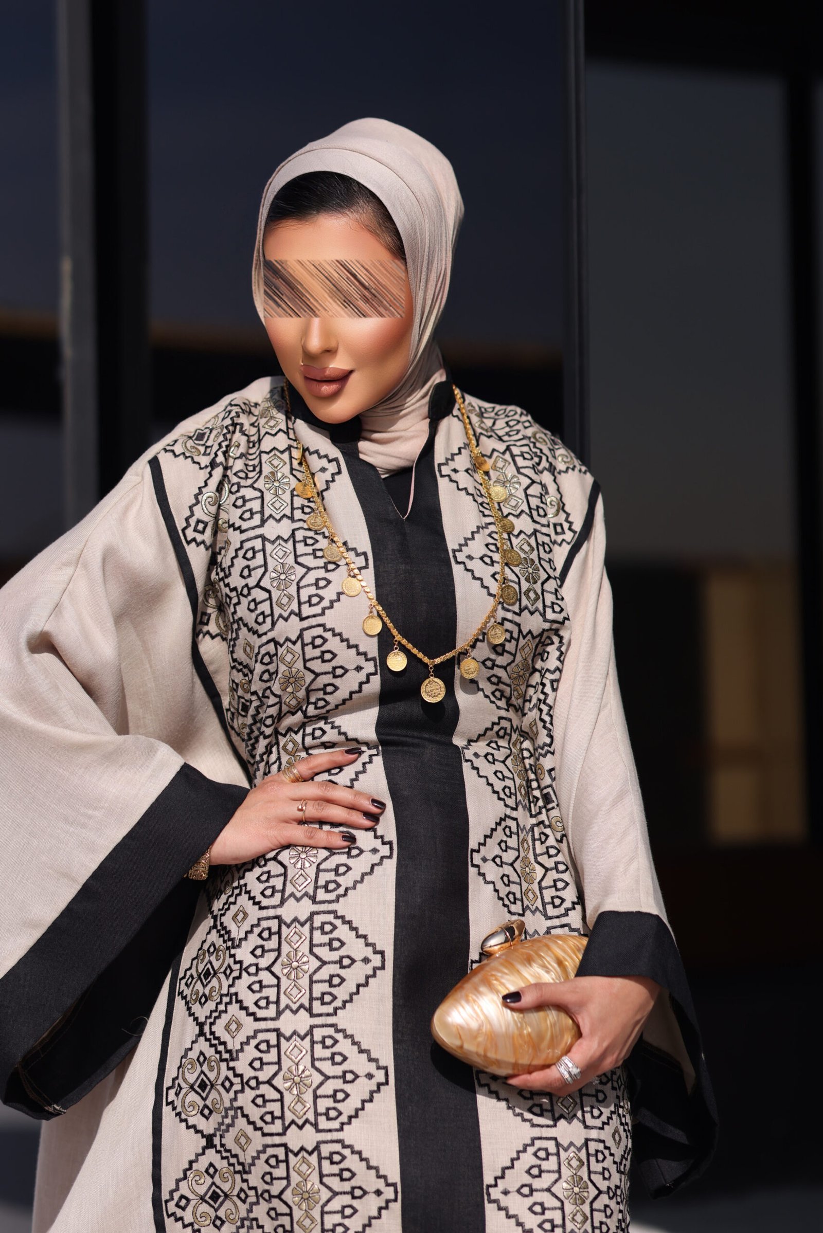 دراعه من القماش اللينن مع تطريز كامله من الامام فري سايز مع حزام داخلي مع بطانه