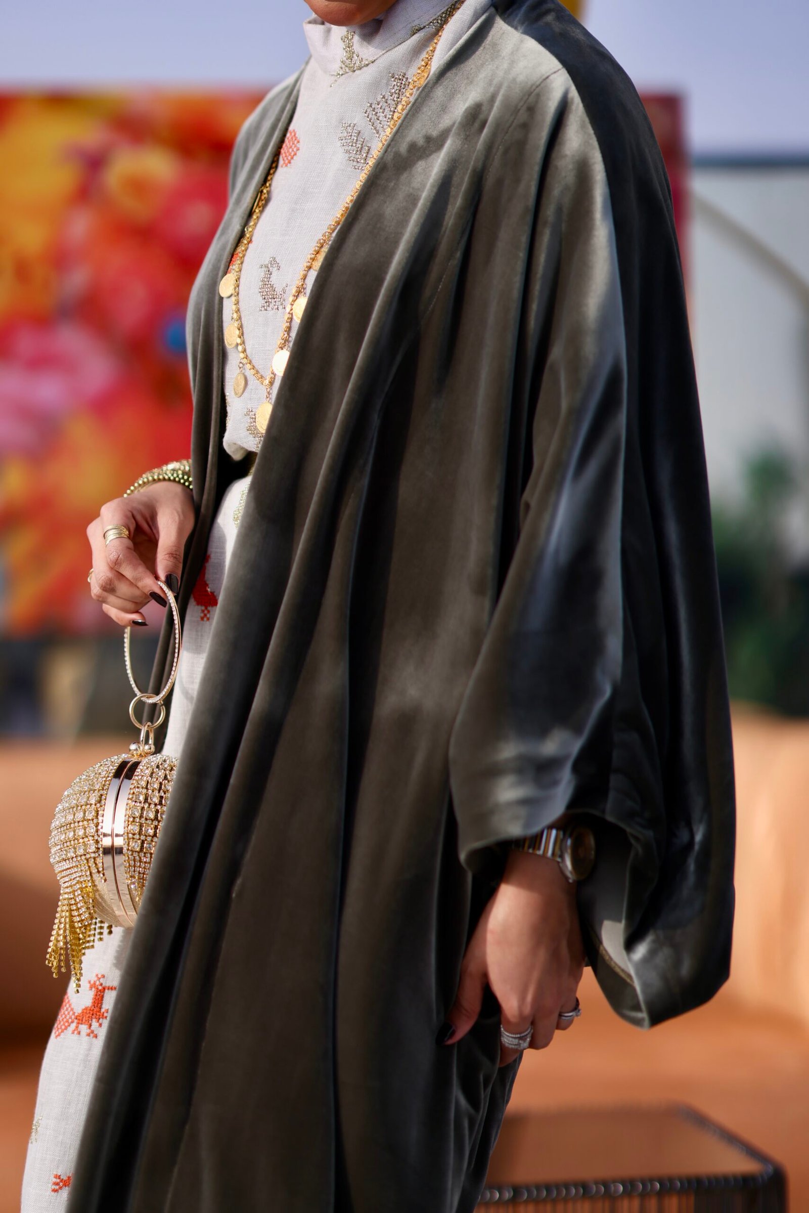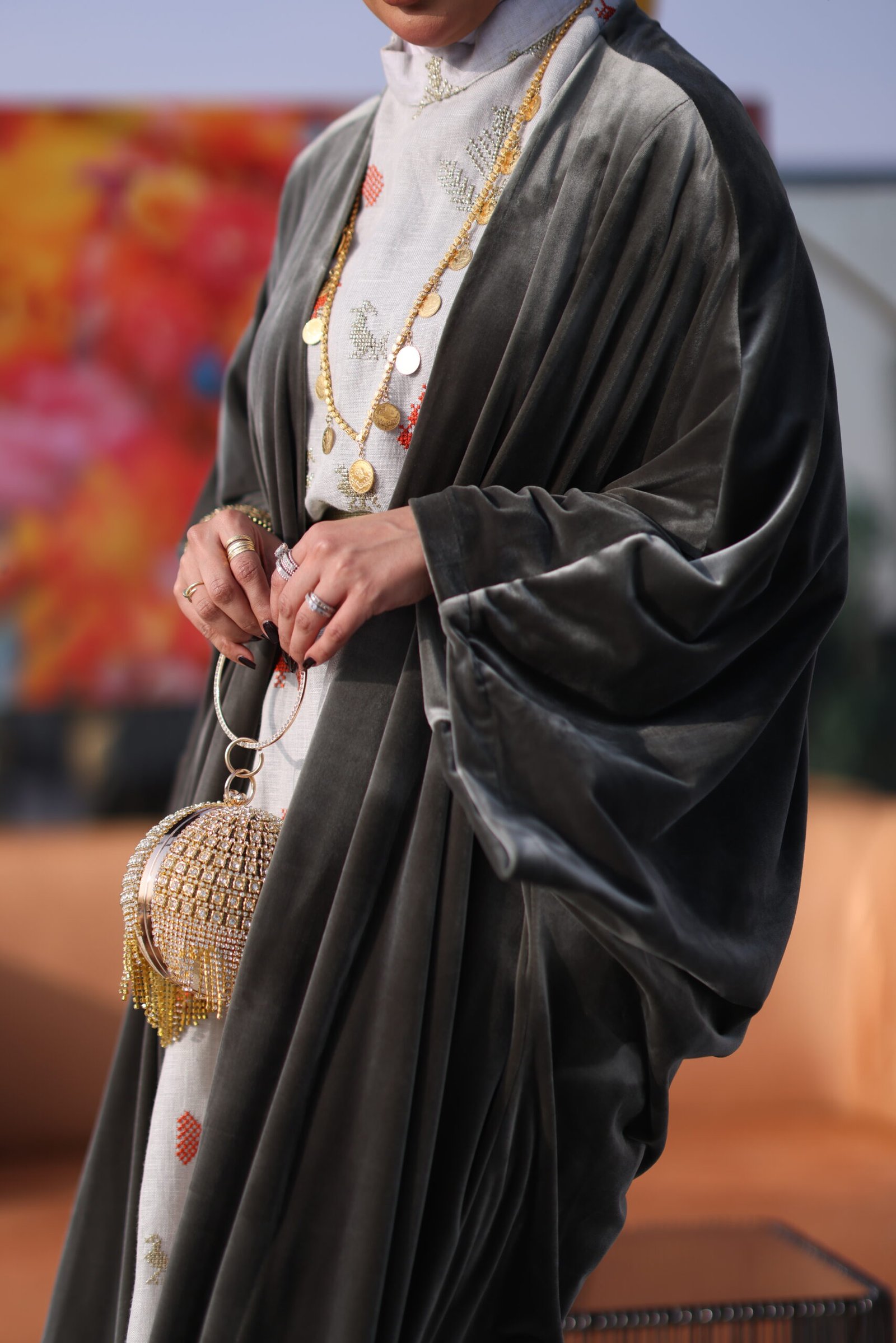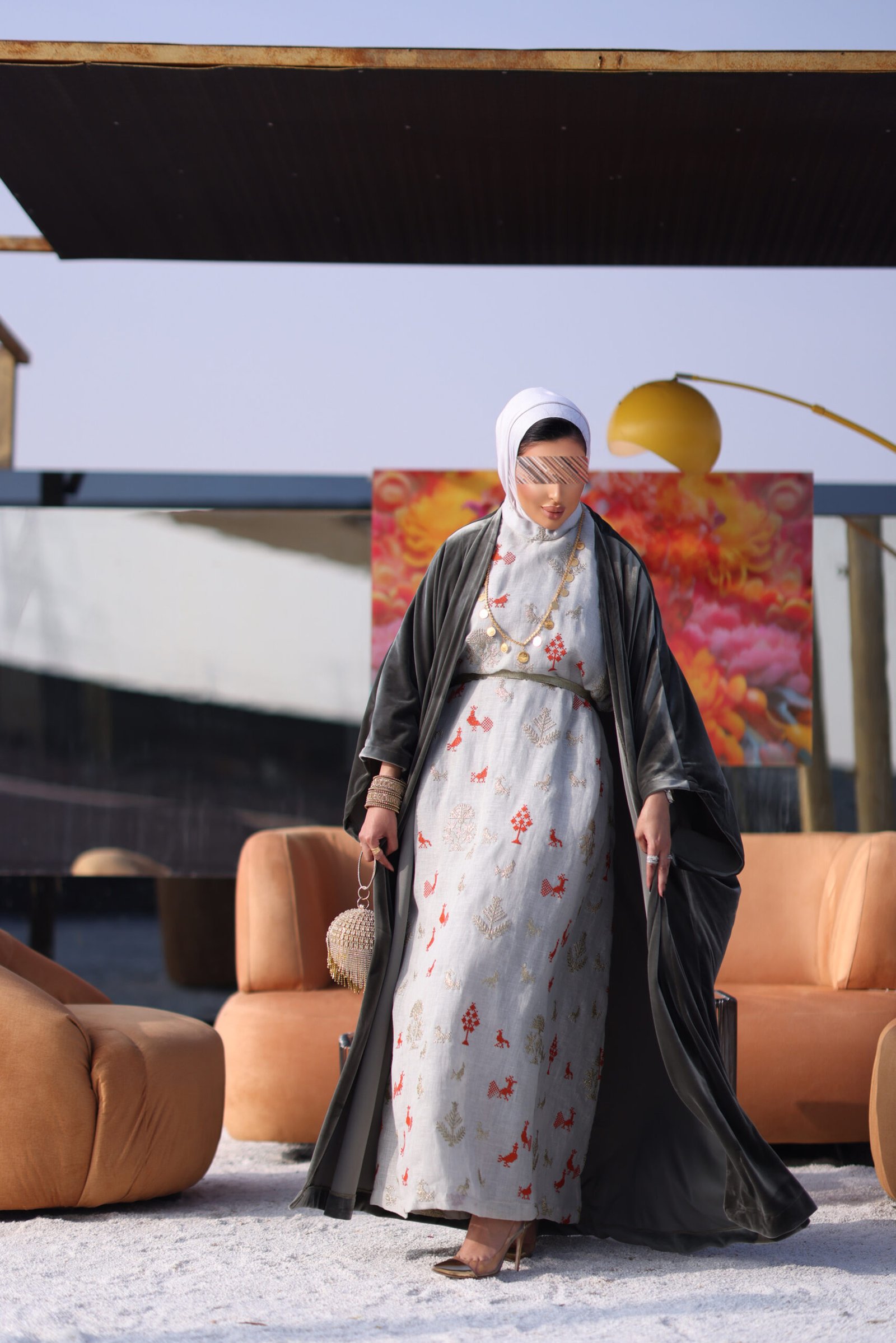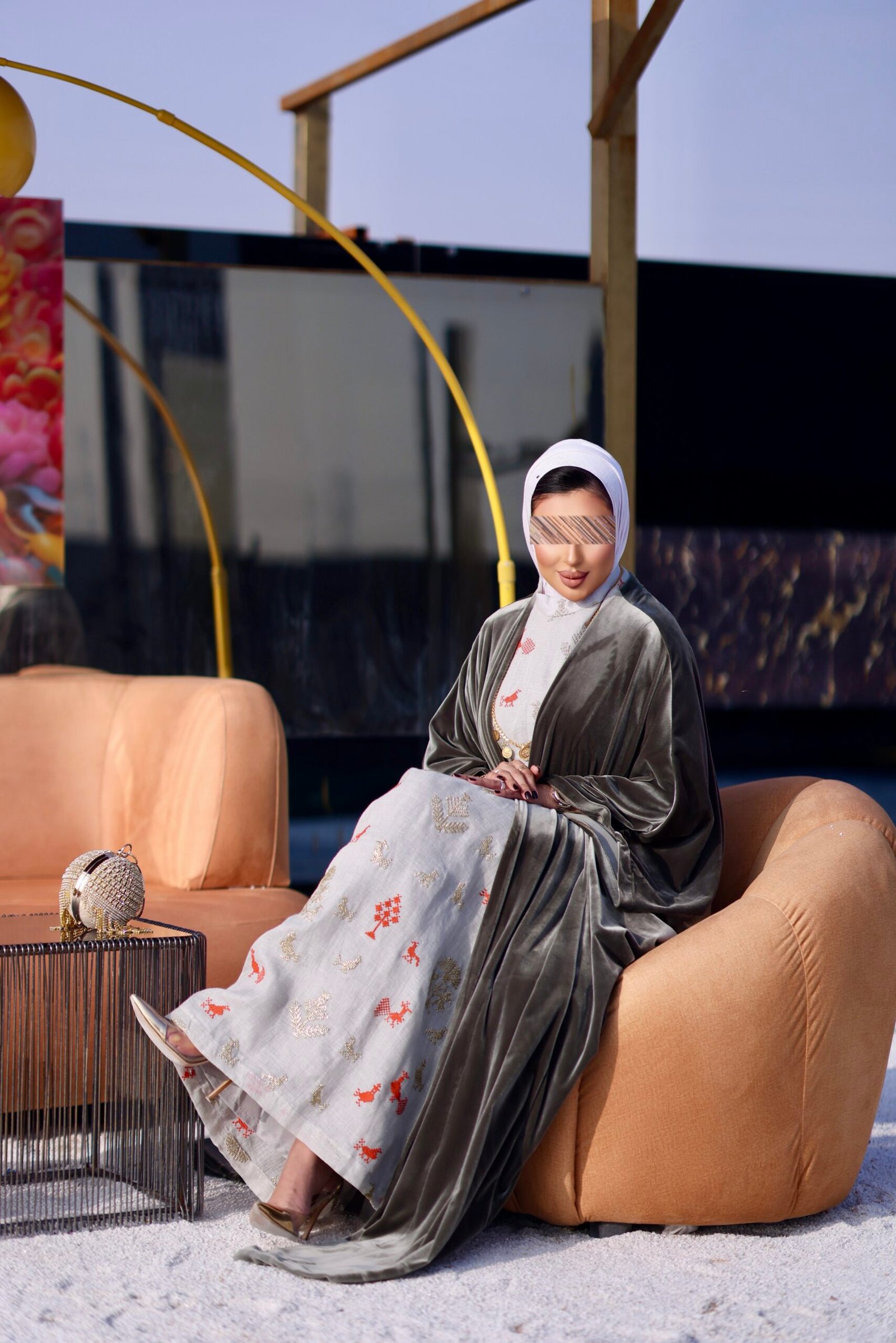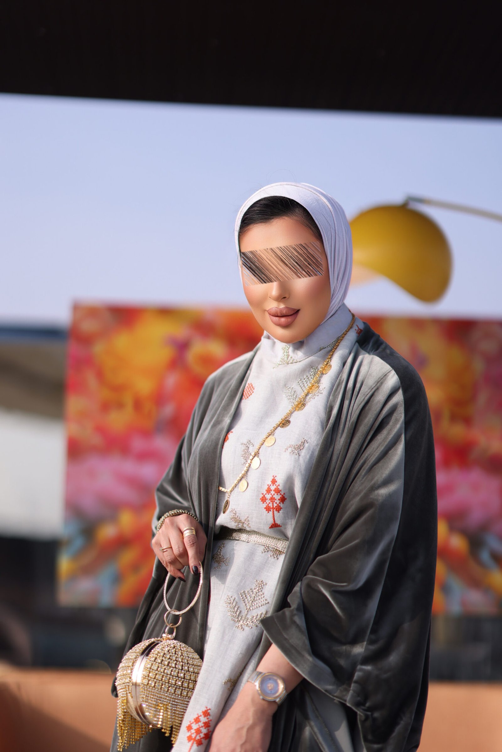 دراعه من قطعتنين بشت مخمل مع فستان لينن مطرز بالكامل مع حزام