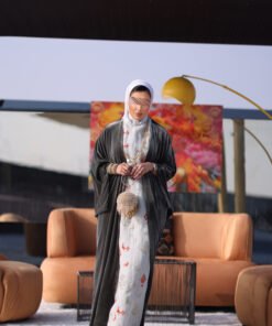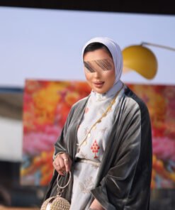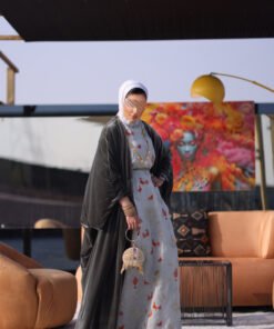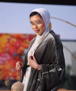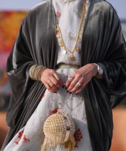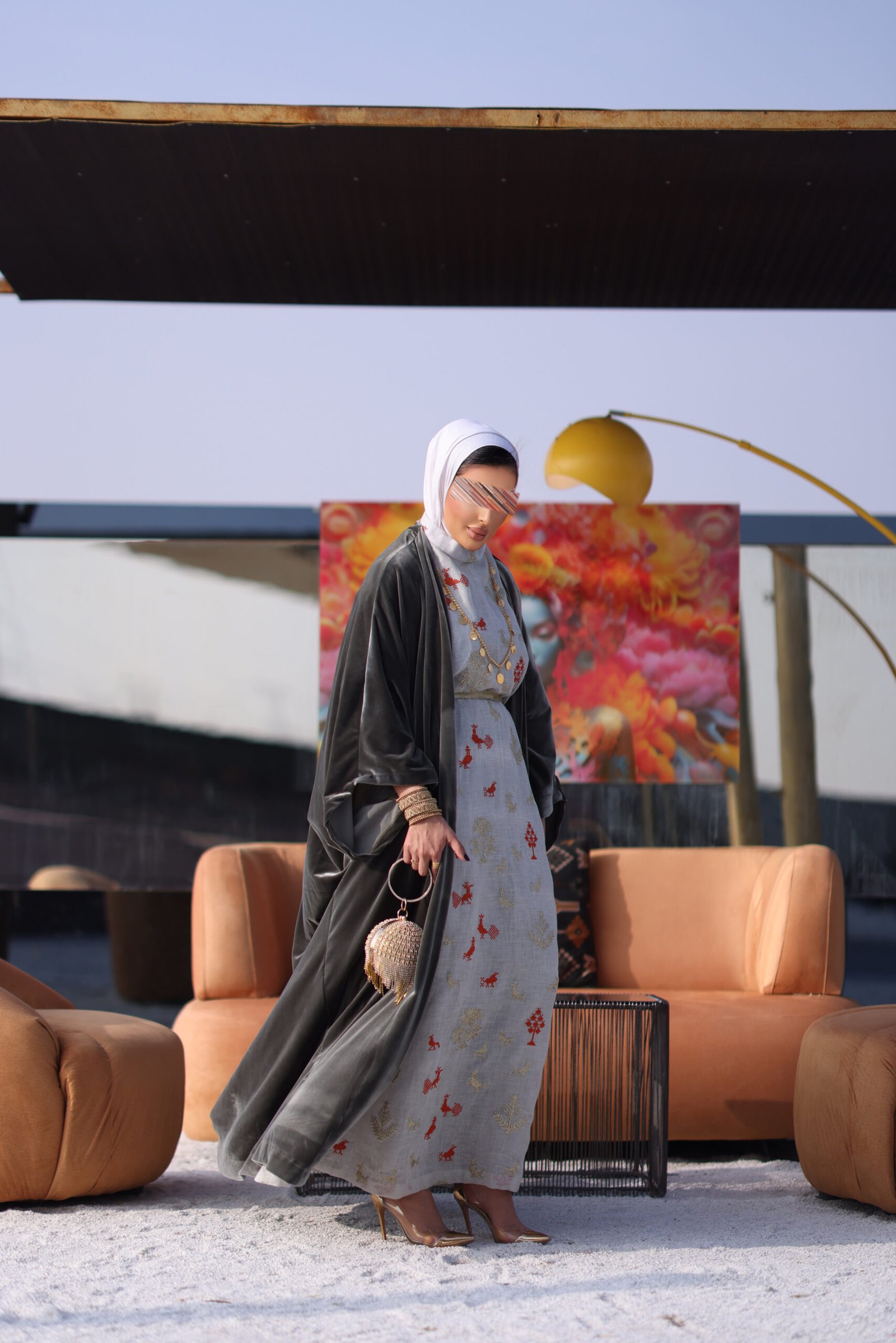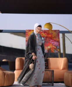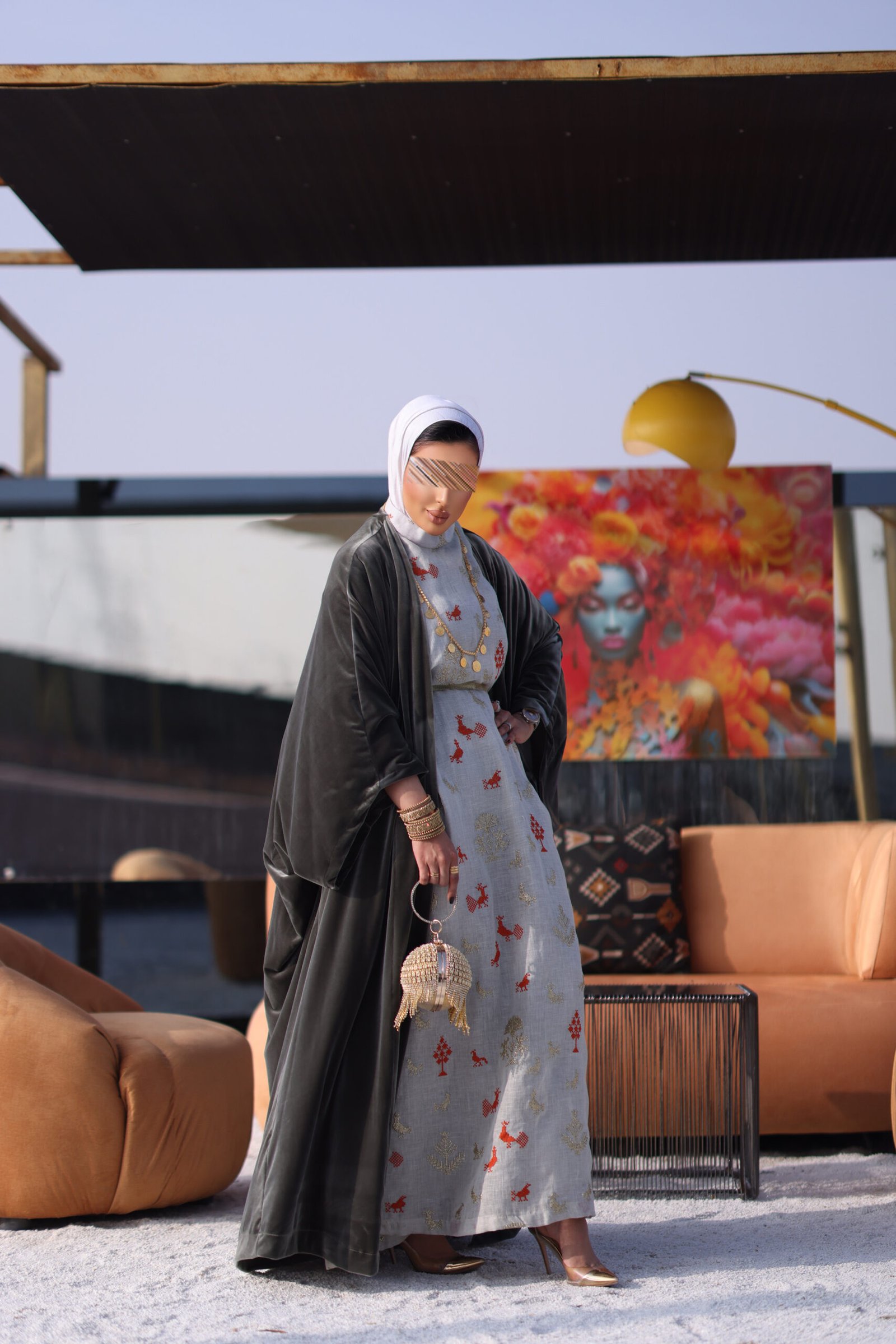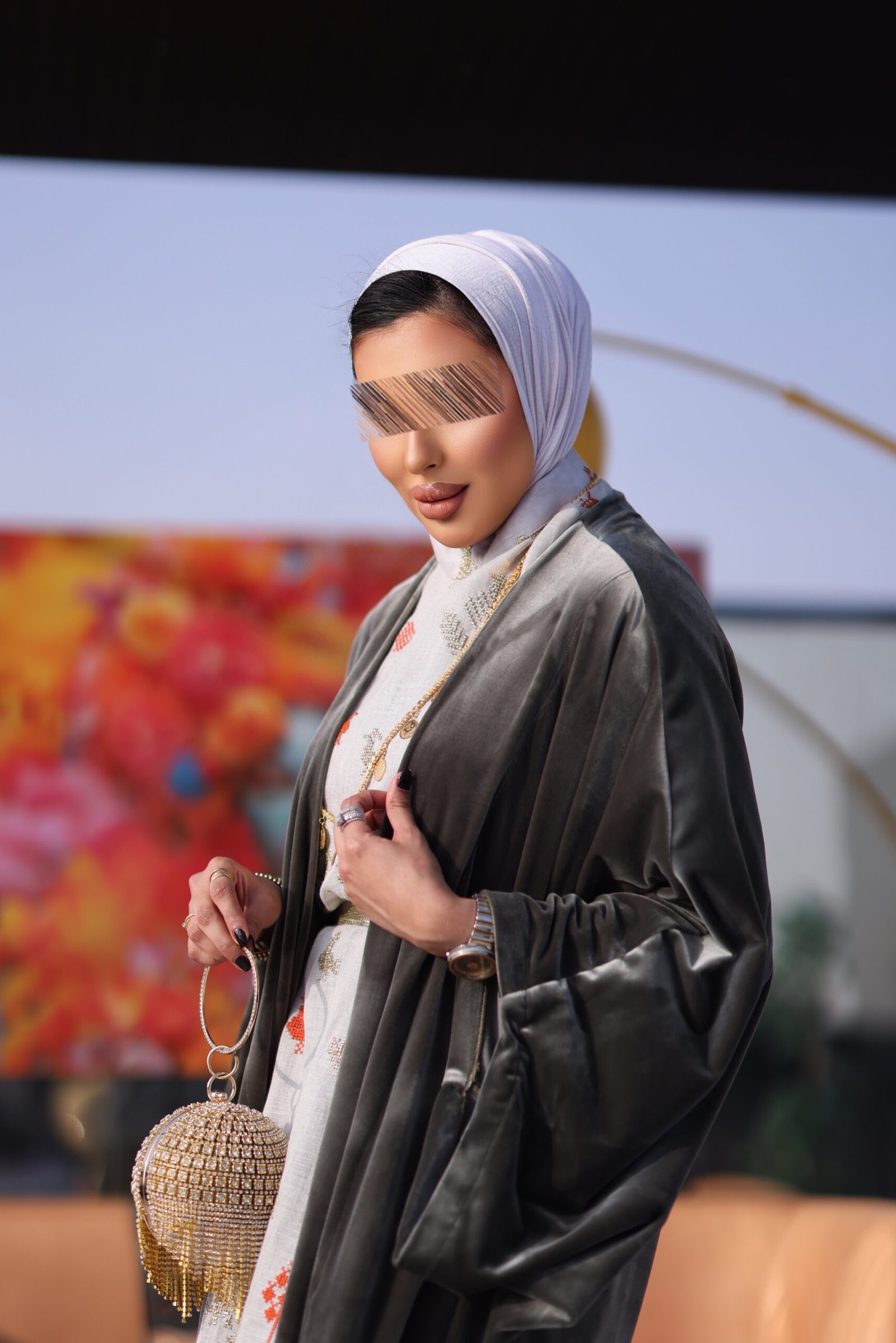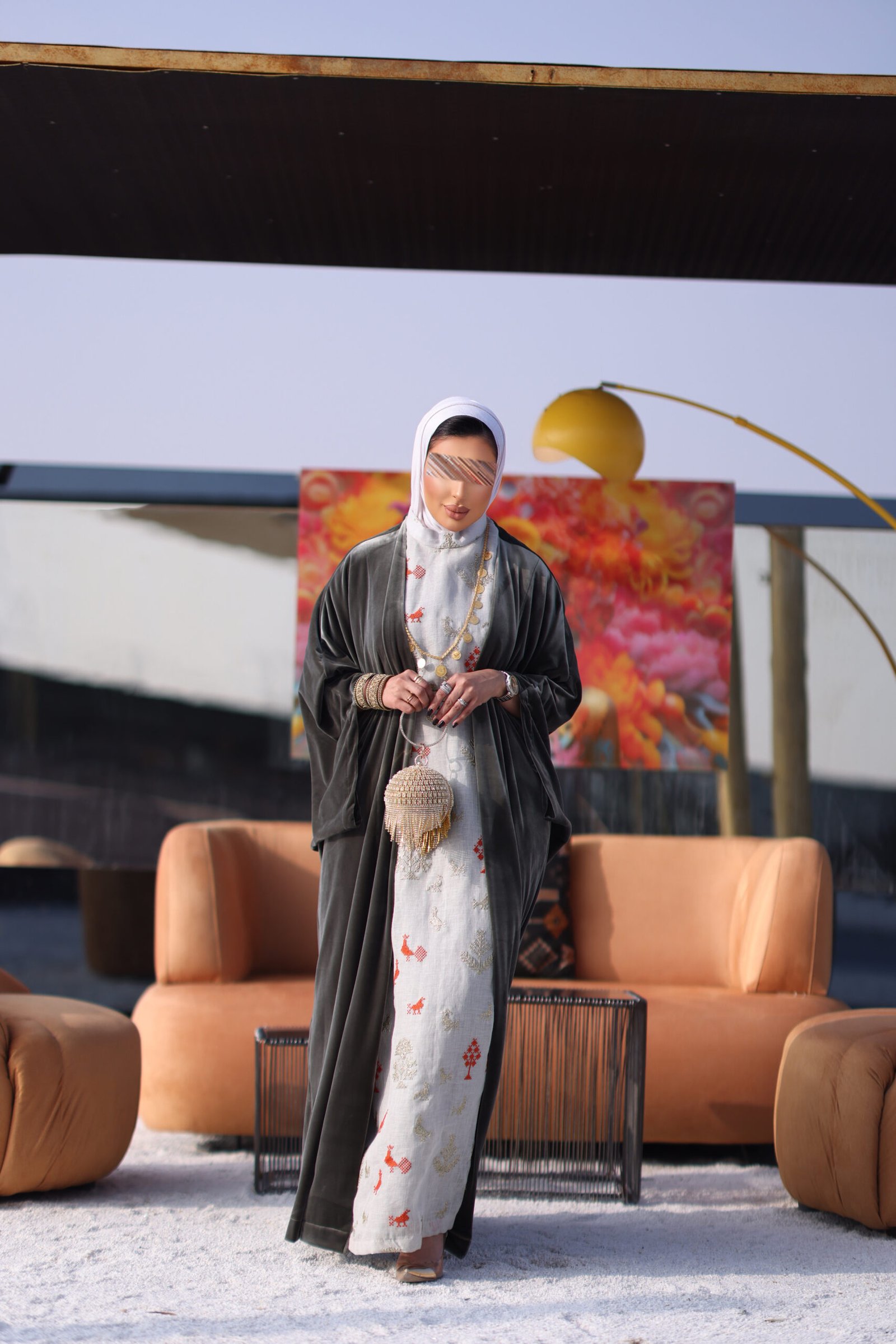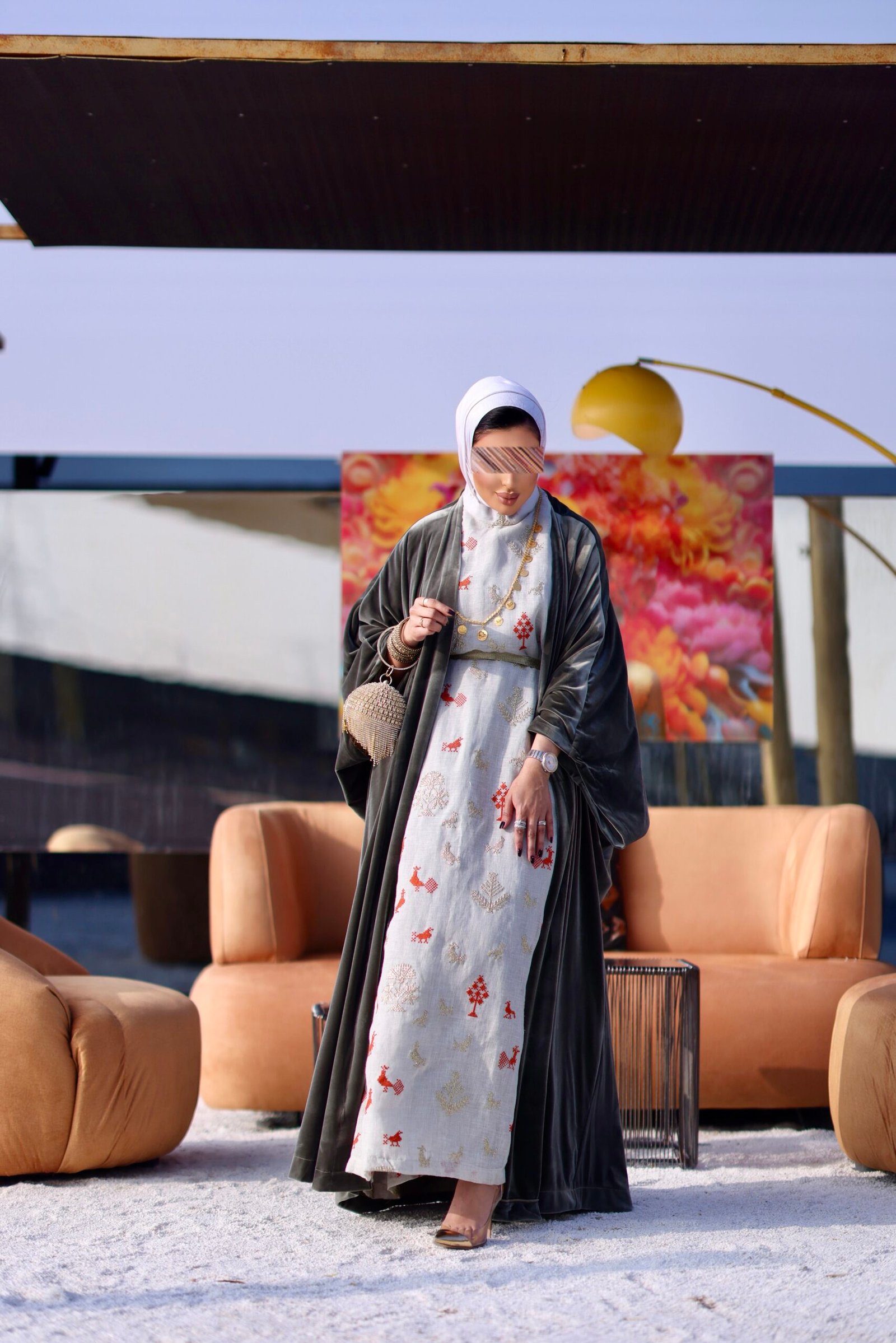 دراعه من قطعتنين بشت مخمل مع فستان لينن مطرز بالكامل مع حزام