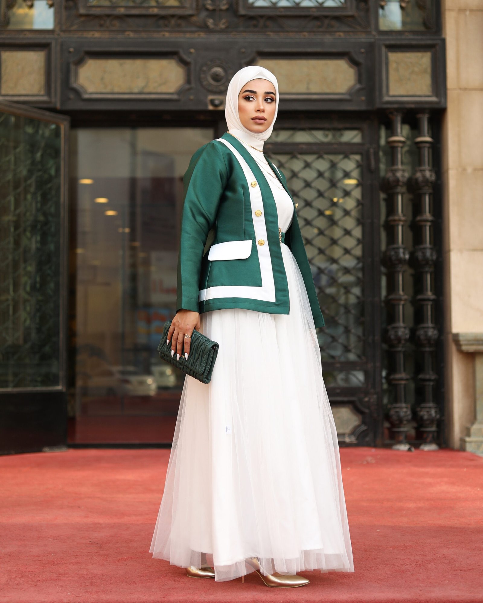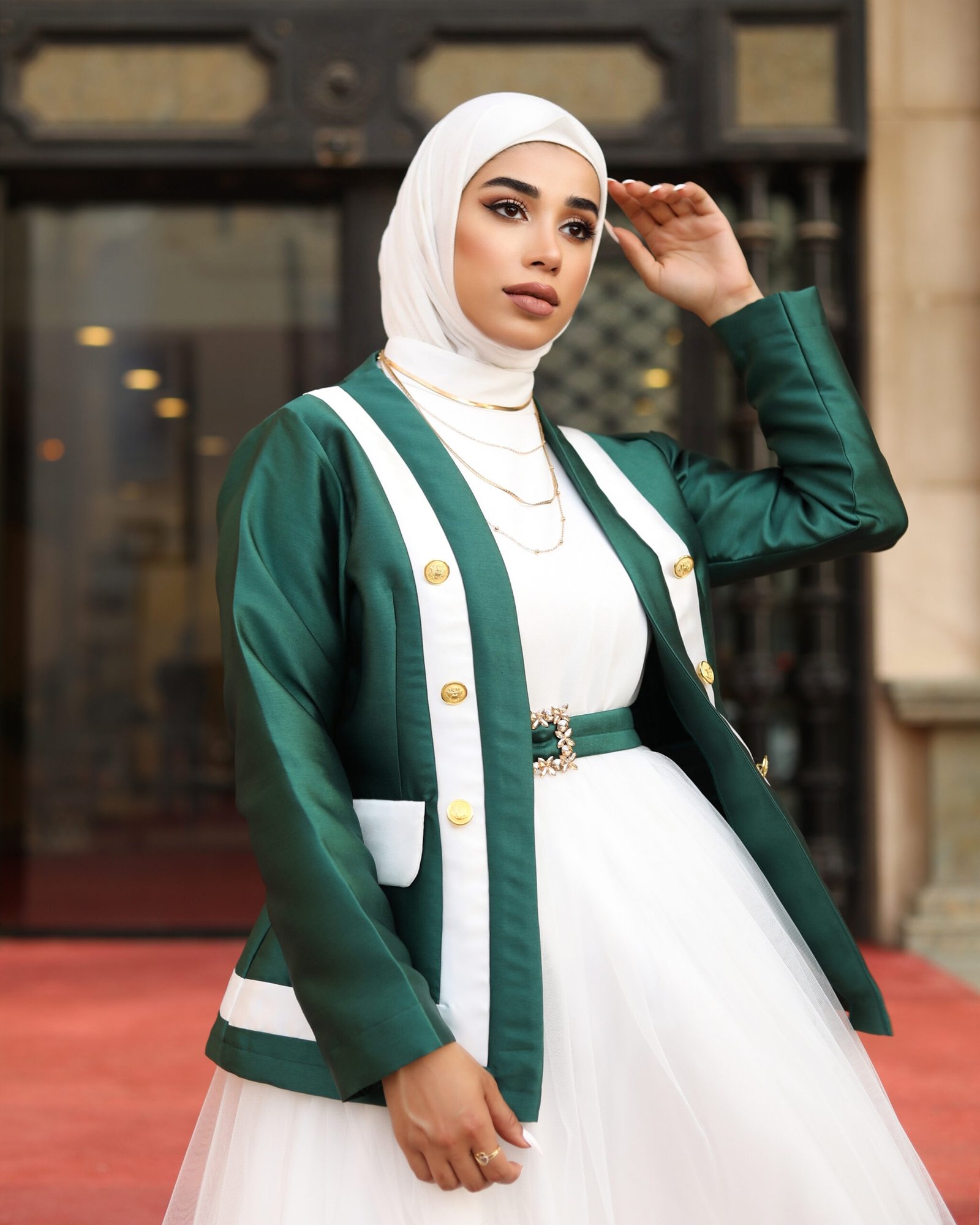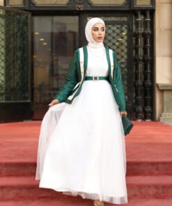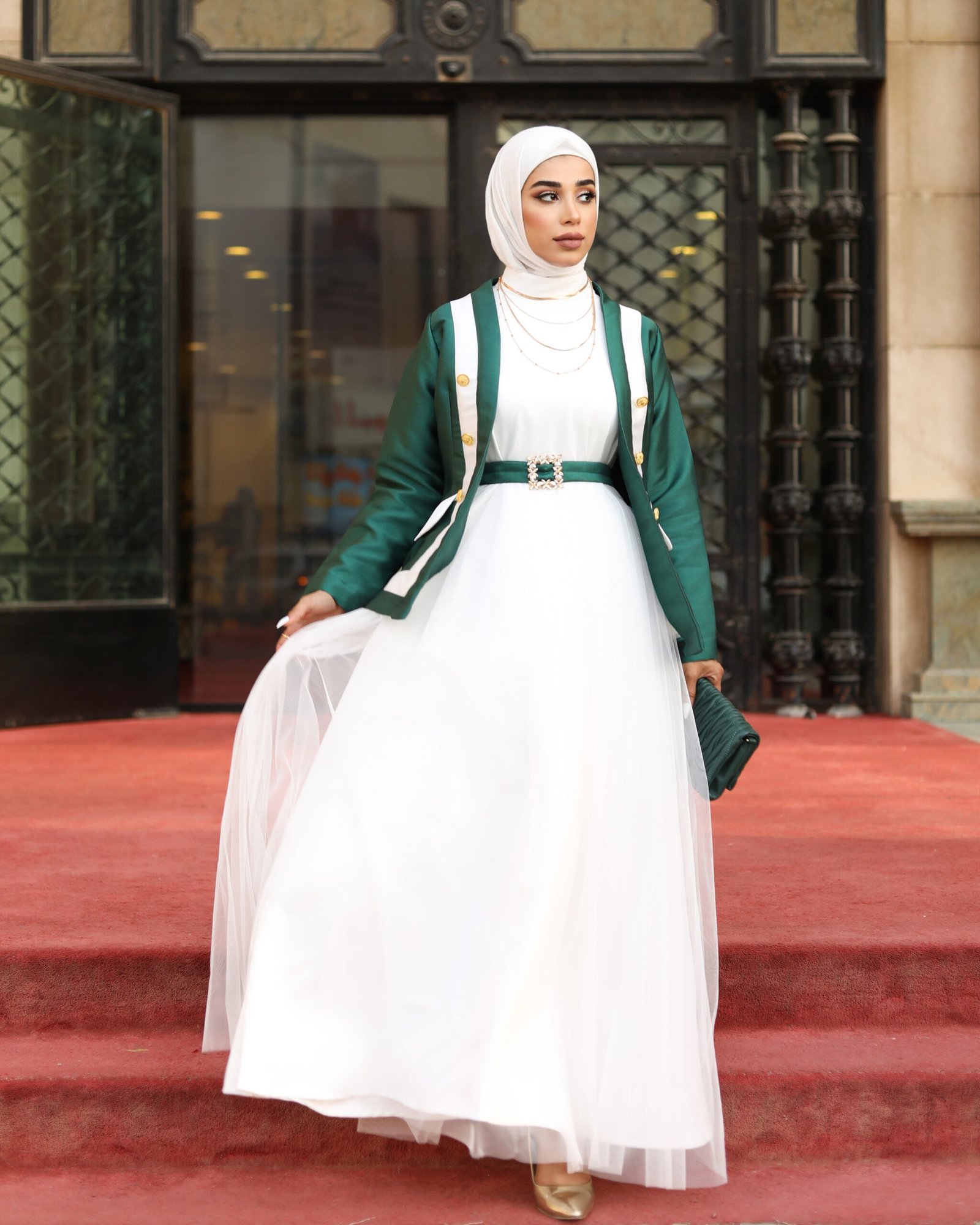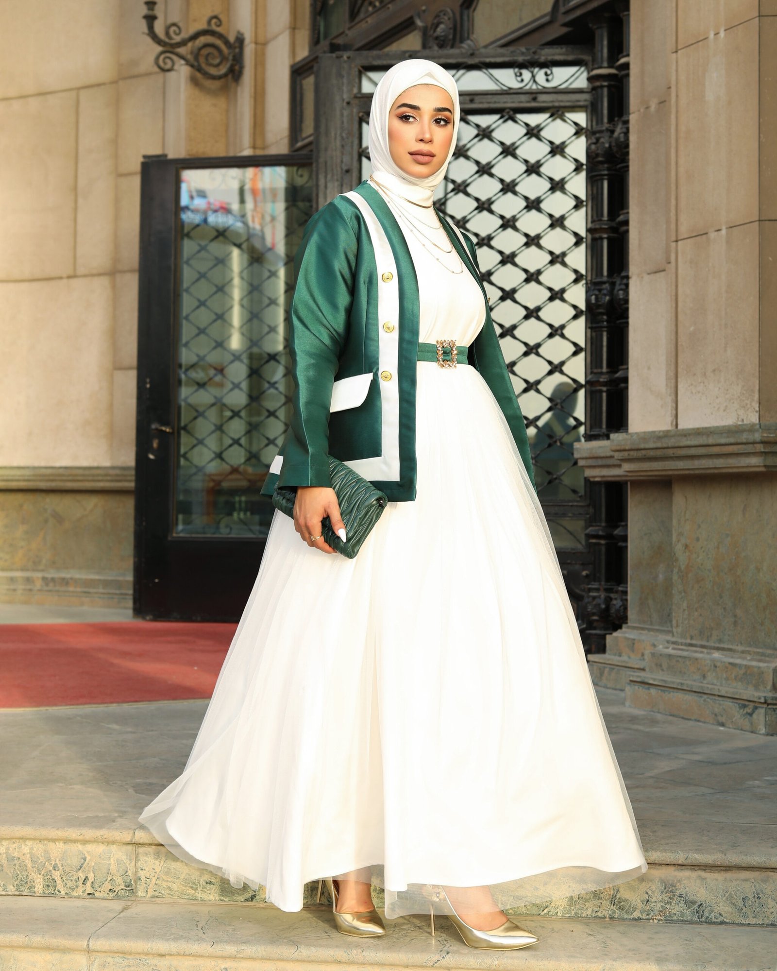 بداه من قطعتين جاكت وفستان مع تور وحزام كريستال ممكن اختيار لون الجاكت